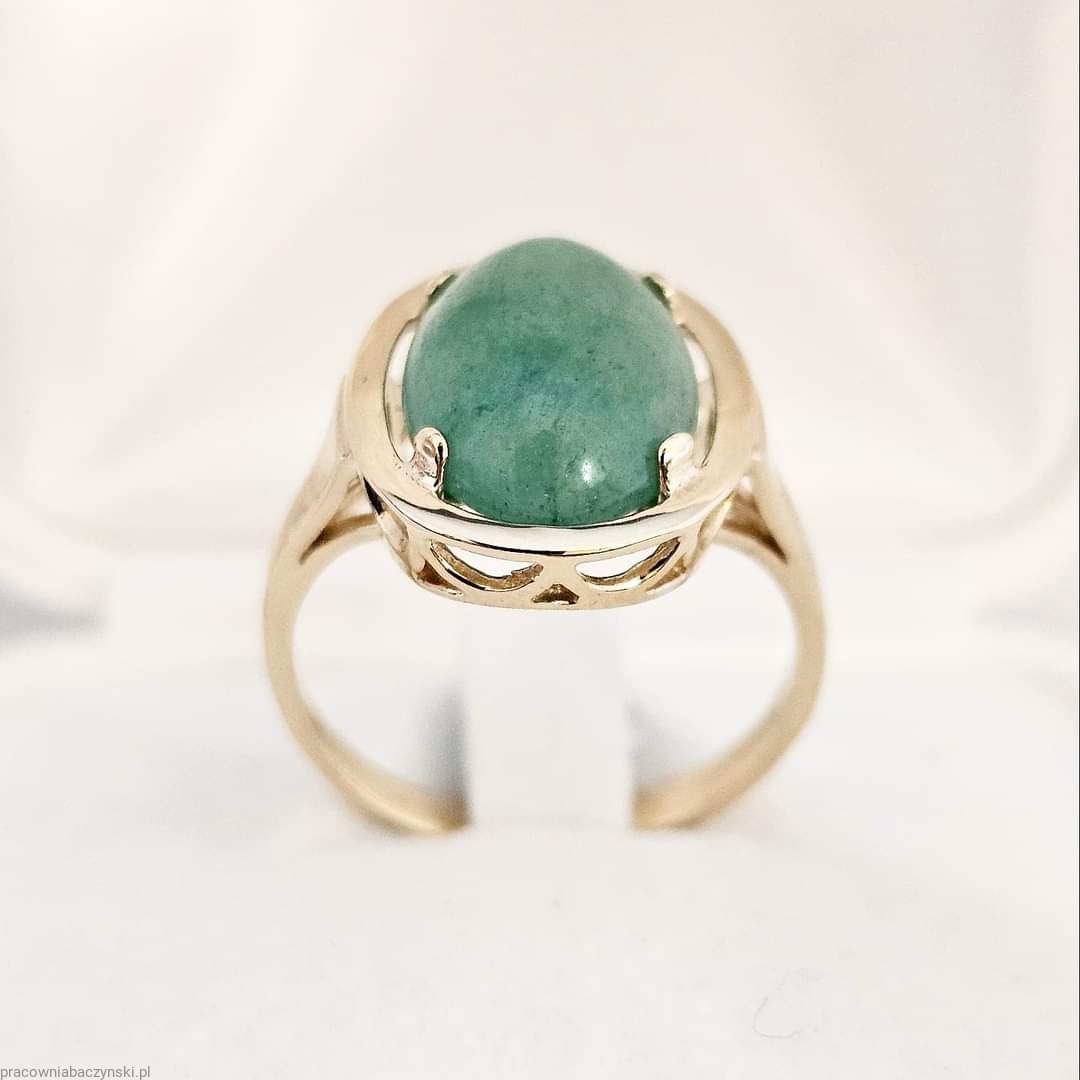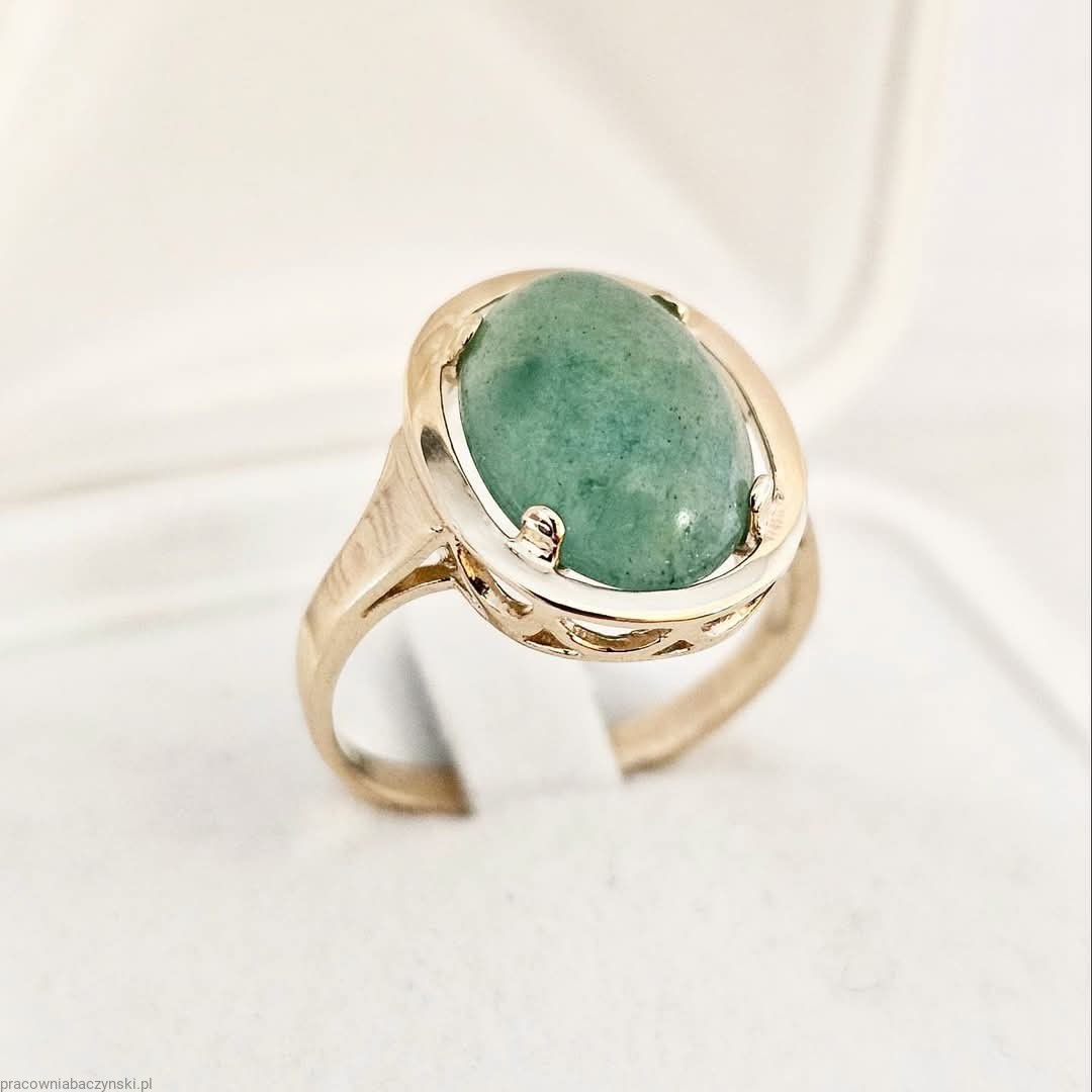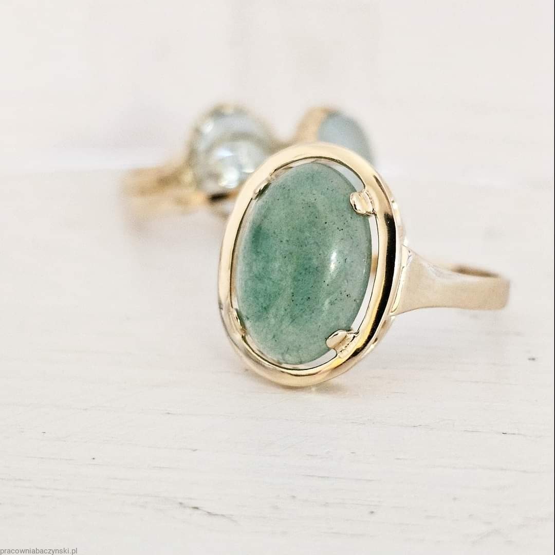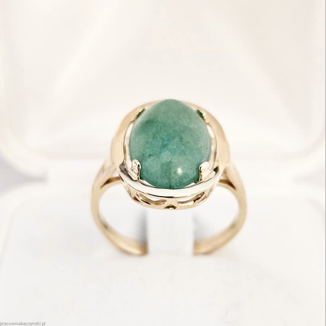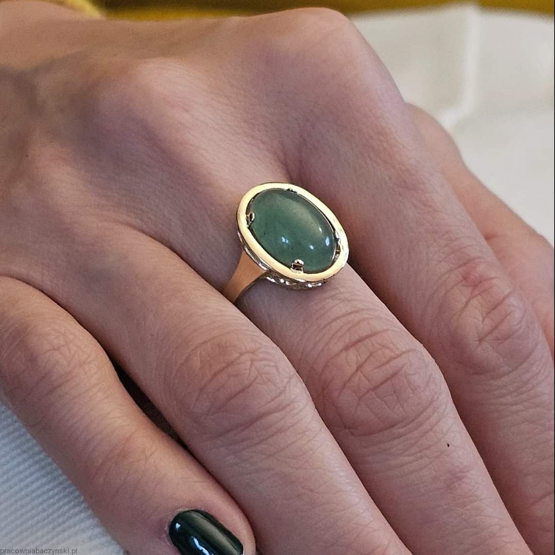Jako centralny punkt pierścionka znajduje się przepiękny jasnozielony Awenturyn o wymiarach 15/11mm. Wpływ na optyczne zalety tego egzemplarza ma tutaj pochodzenie minerału i jego skład chemiczny z dużą zawartością pierwiastków żelaza. Masa kamienia wynosi około 5.2ct, co czyni go nie tylko pięknym, ale również imponującym kamieniem centralnym.