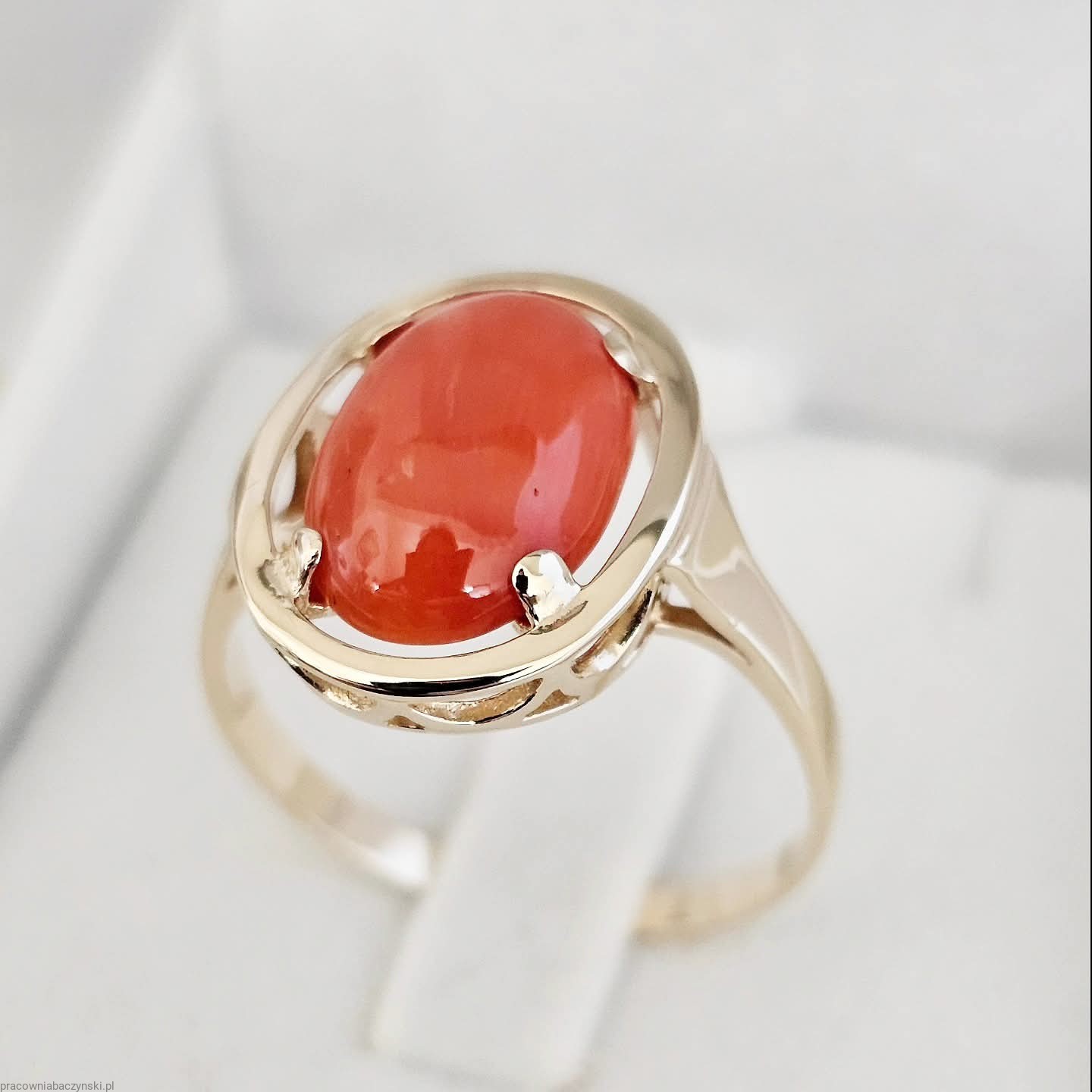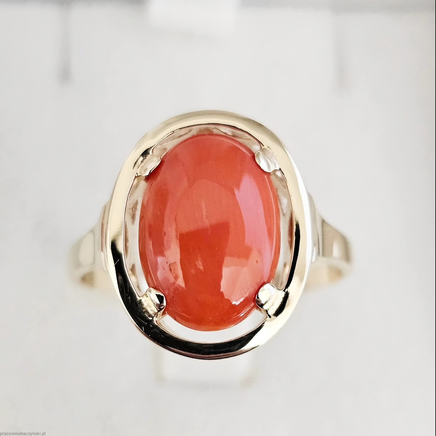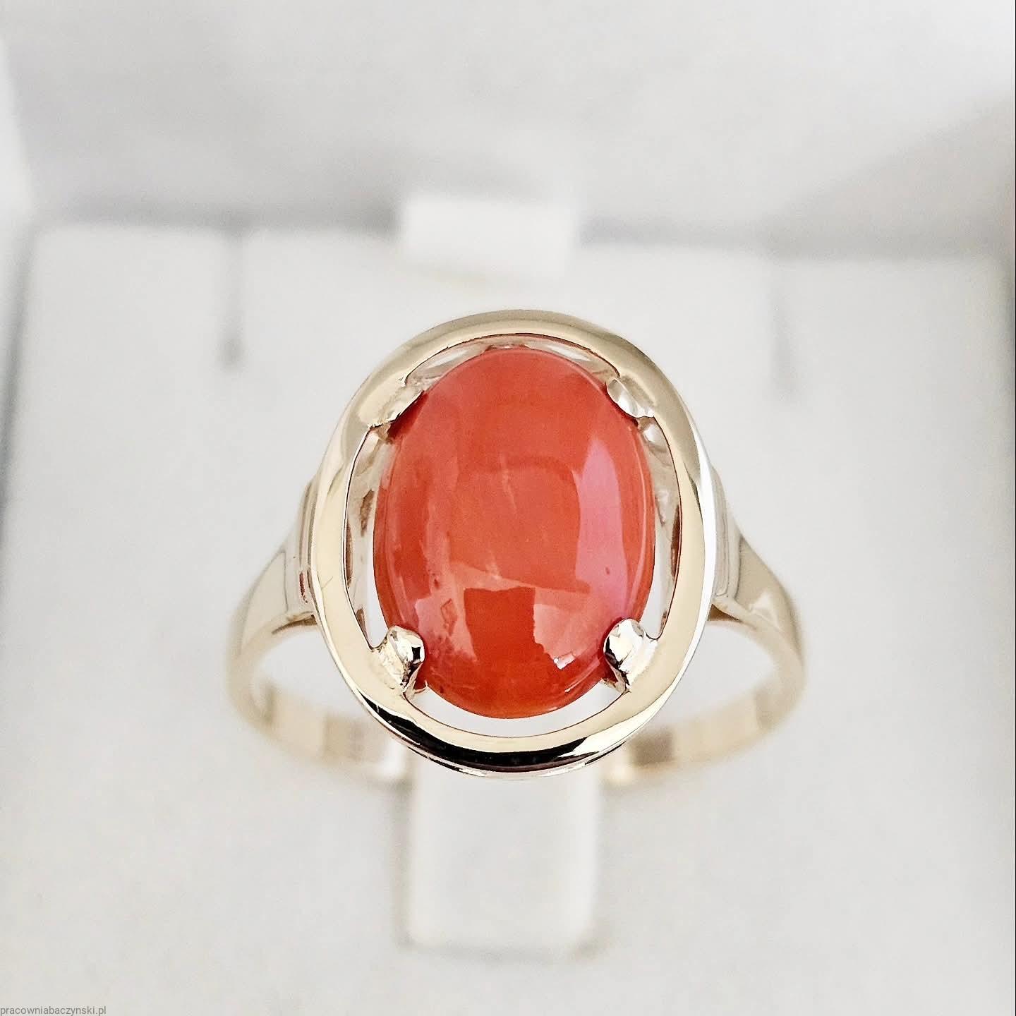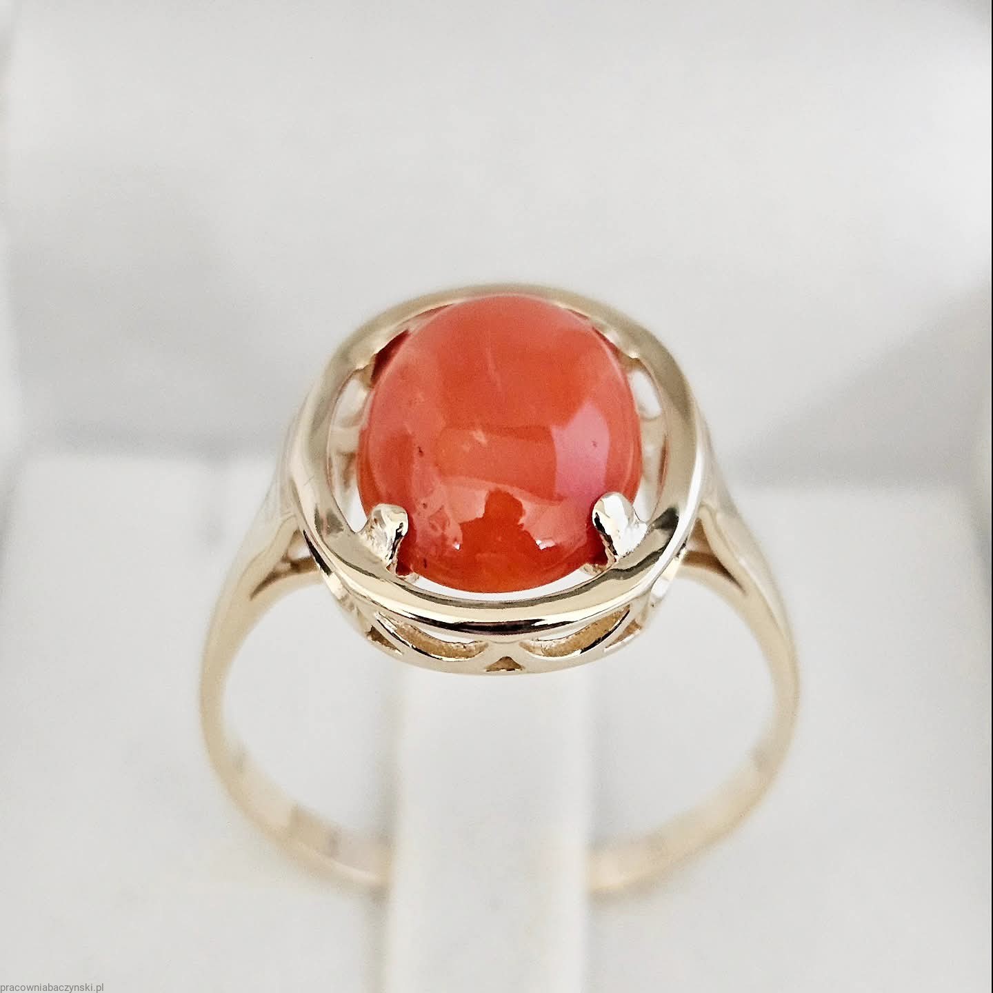 Jako centralny punkt pierścionka znajduje się przepiękny Koral Szlachetny o barwie mocno intensywnej to dowód wysokiej jskosci minerału . Wpływ na optyczne zalety tego egzemplarza ma tutaj pochodzenie i jego skład chemiczny. Povhodxi z basenu morza Śródziemnego. Wysoka jakość szlifu kaboszonowego i wysoki połysk dają niesamowicie piękny efekt. Masa kamienia wynosi około 6.2ct, co czyni go nie tylko pięknym, ale również imponującym kamieniem centralnym.