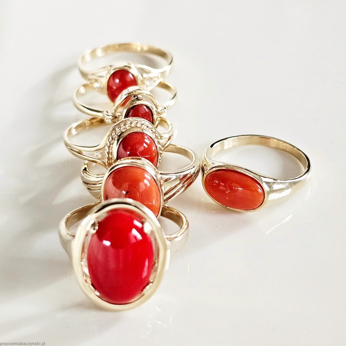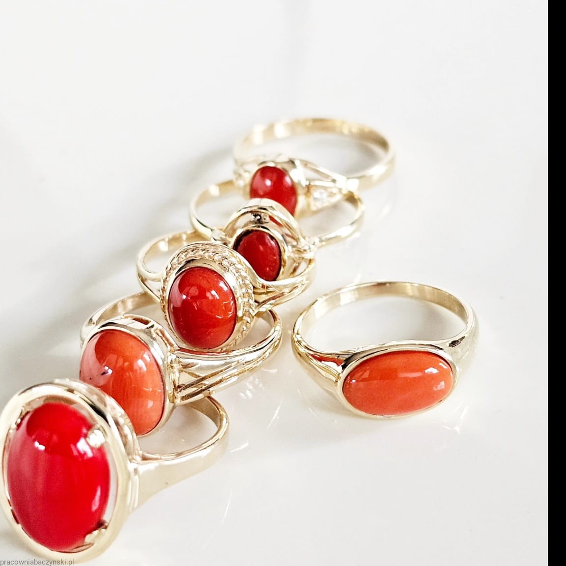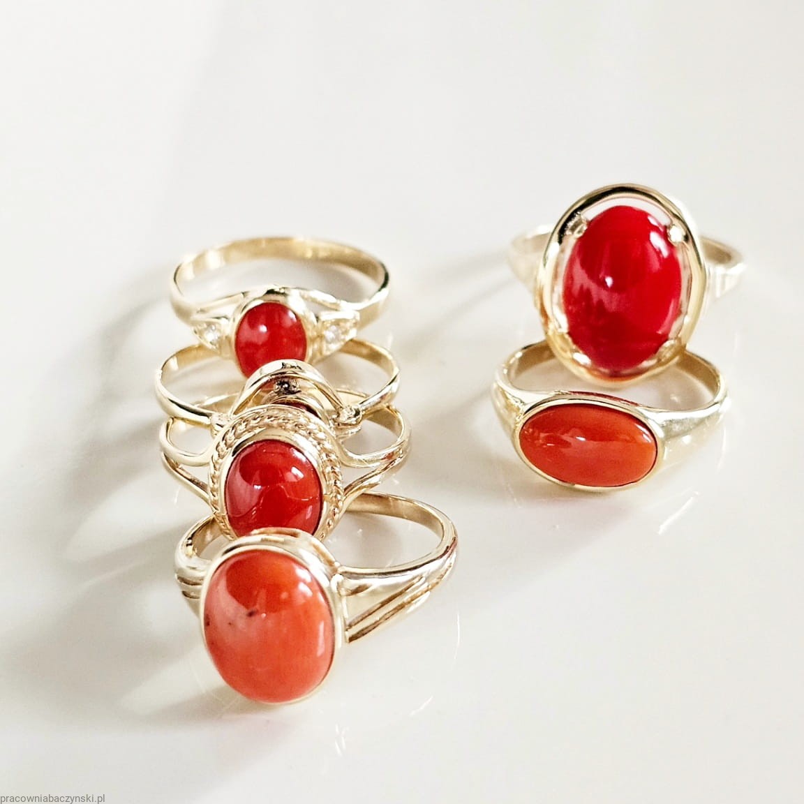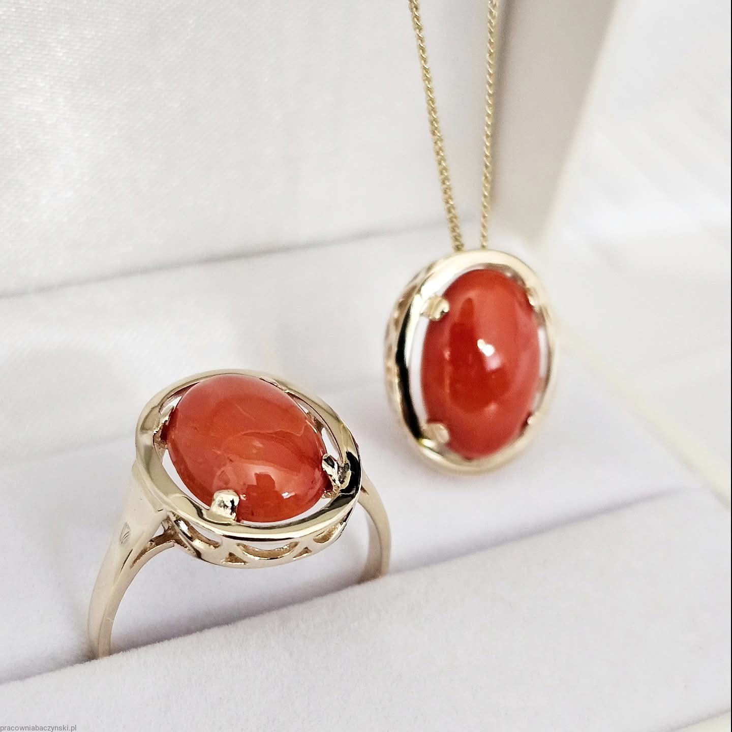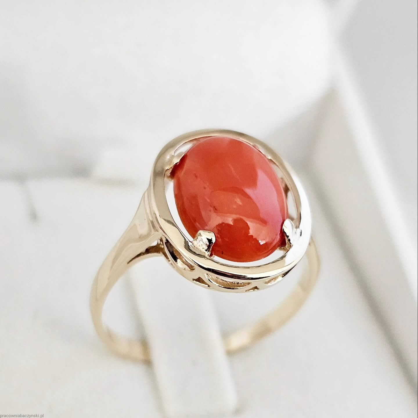 Jako centralny punkt pierścionka znajduje się przepiękny Koral Szlachetny o barwie mocno intensywnej to dowód wysokiej jskosci minerału . Wpływ na optyczne zalety tego egzemplarza ma tutaj pochodzenie i jego skład chemiczny. Povhodxi z basenu morza Śródziemnego. Wysoka jakość szlifu kaboszonowego i wysoki połysk dają niesamowicie piękny efekt. Masa kamienia wynosi około 6.2ct, co czyni go nie tylko pięknym, ale również imponującym kamieniem centralnym.