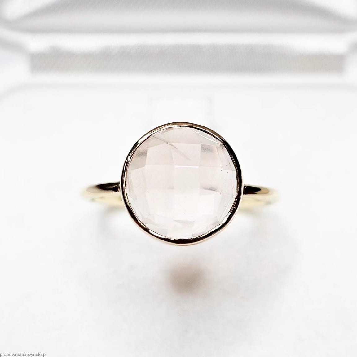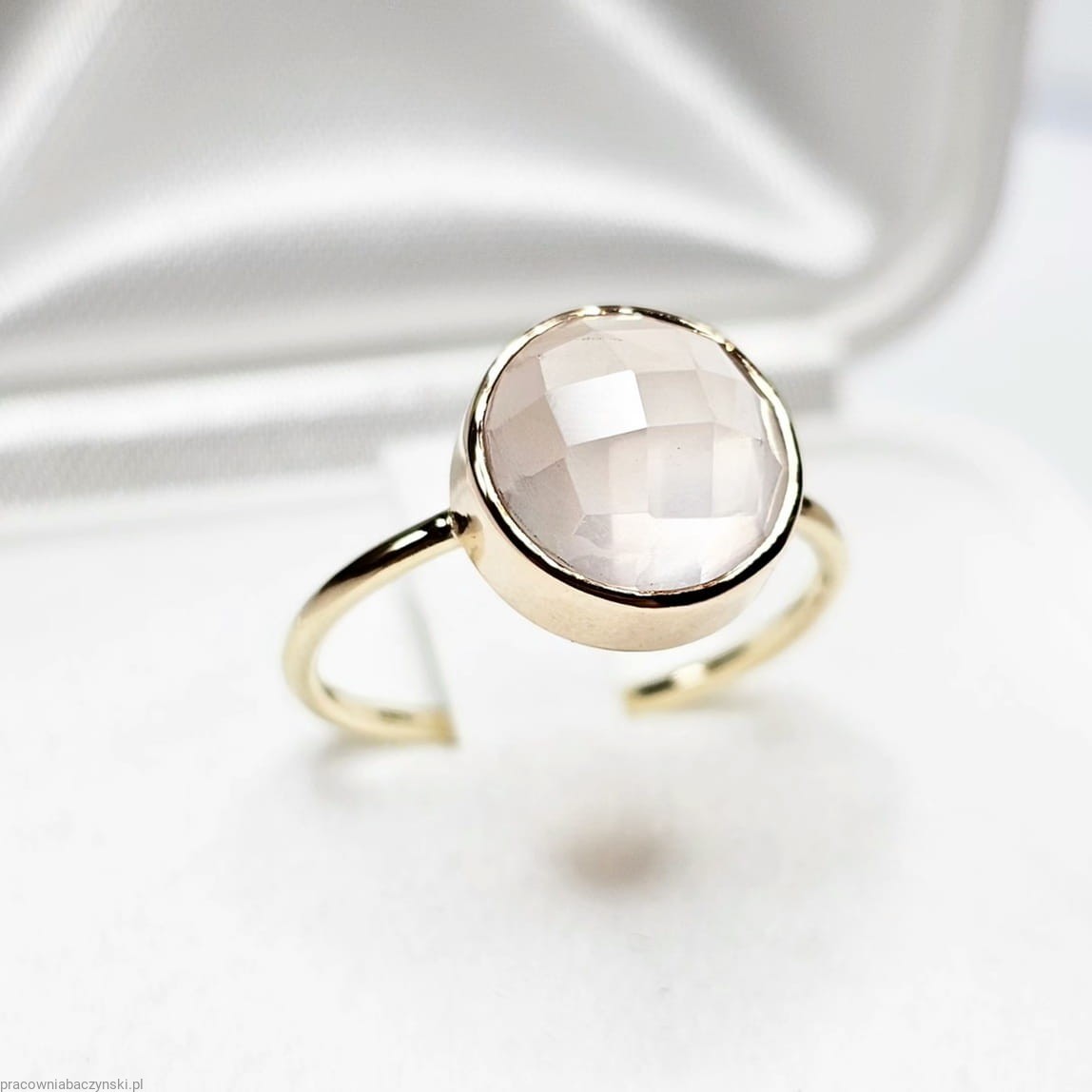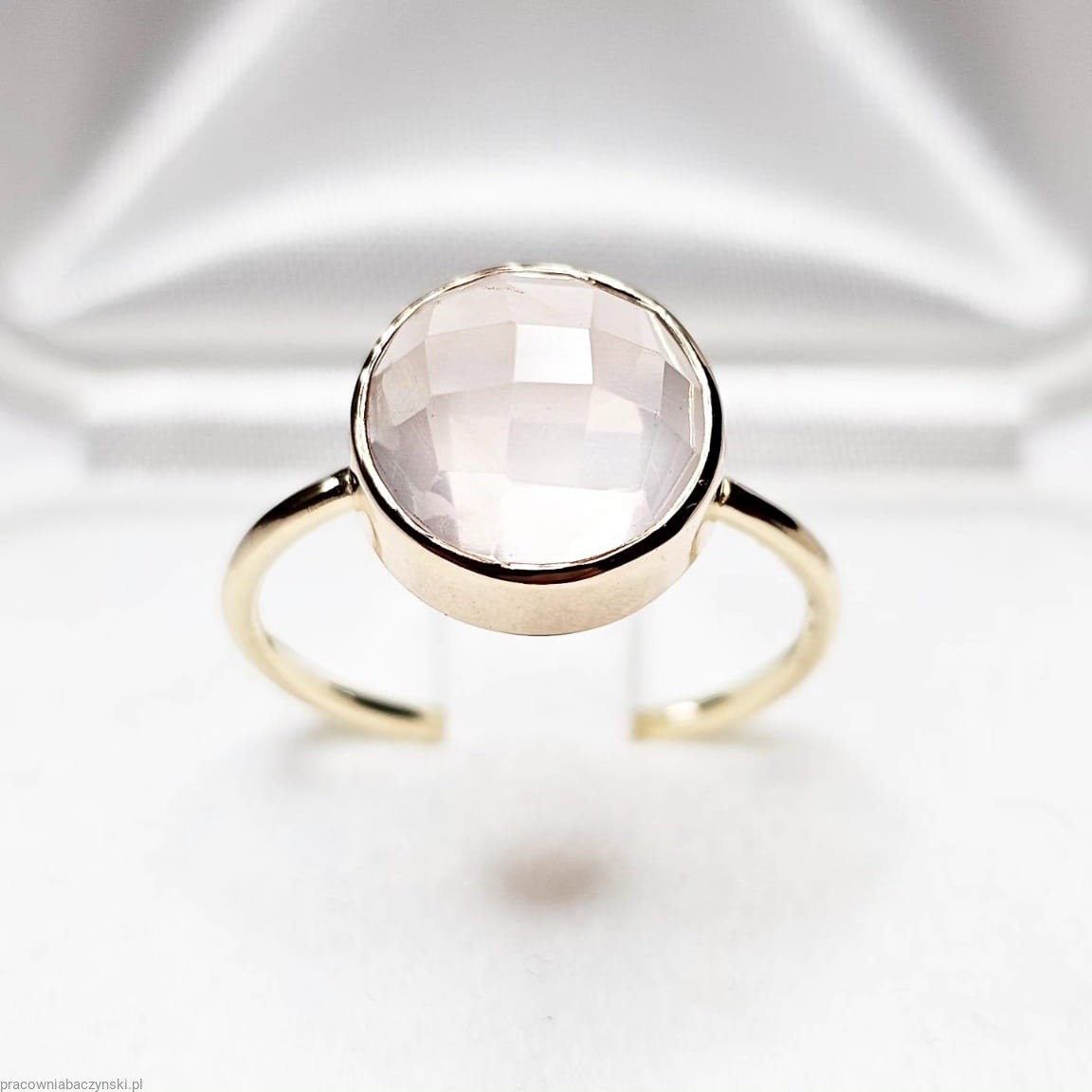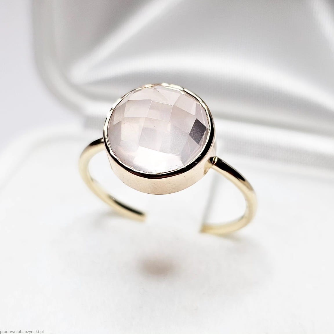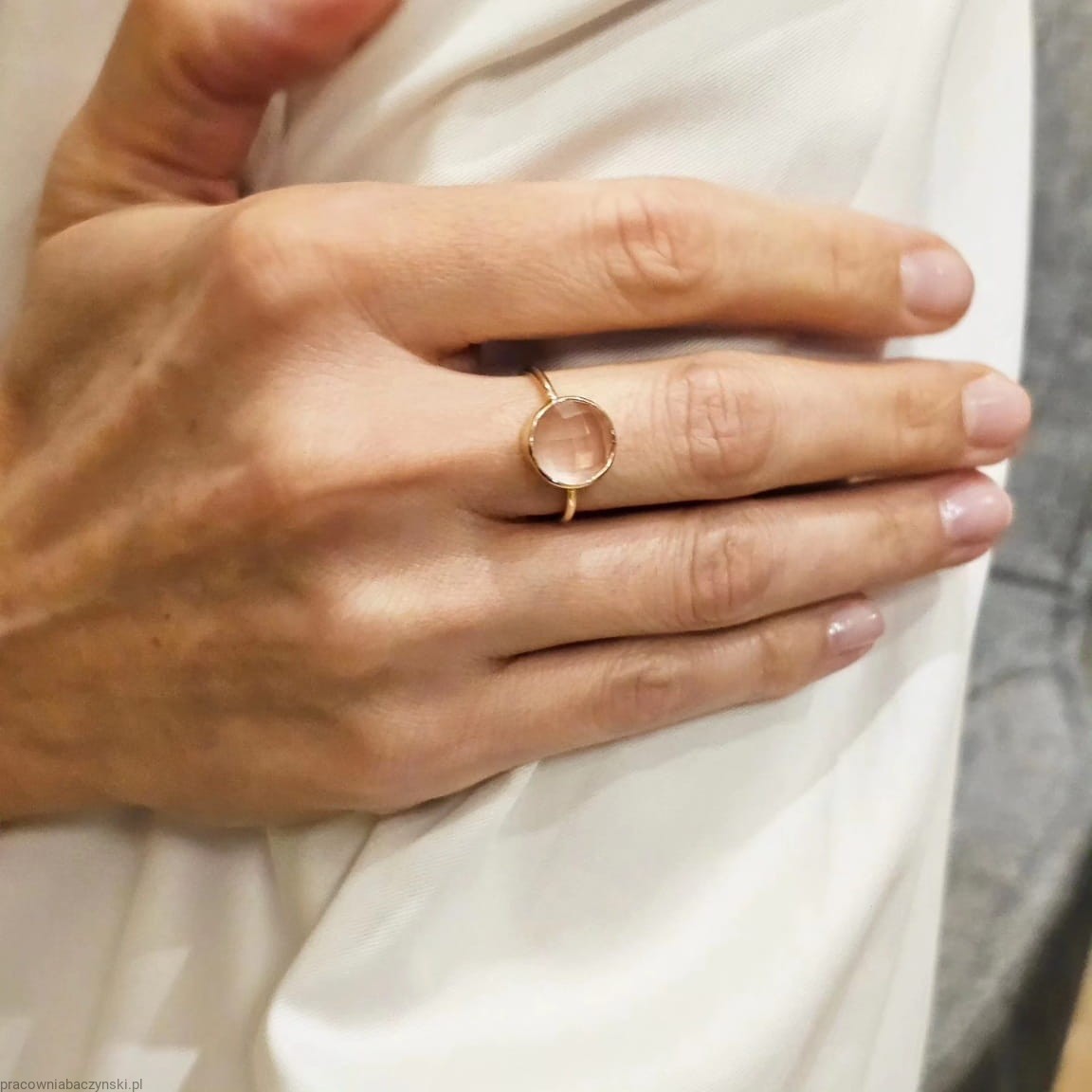 Centralnym punktem jest oszałamiający Kwarc o barwie jasno różowej i szlifie fasetowym okrągłym, o imponujących wymiarach 10mm i masie ok 3.5 karata. Dodatkowo, kamień ten osadzony jest w pierścionku o wysokiej jakości złota 14 karatów (0.585), co nadaje mu trwałość i wyjątkowy blask.