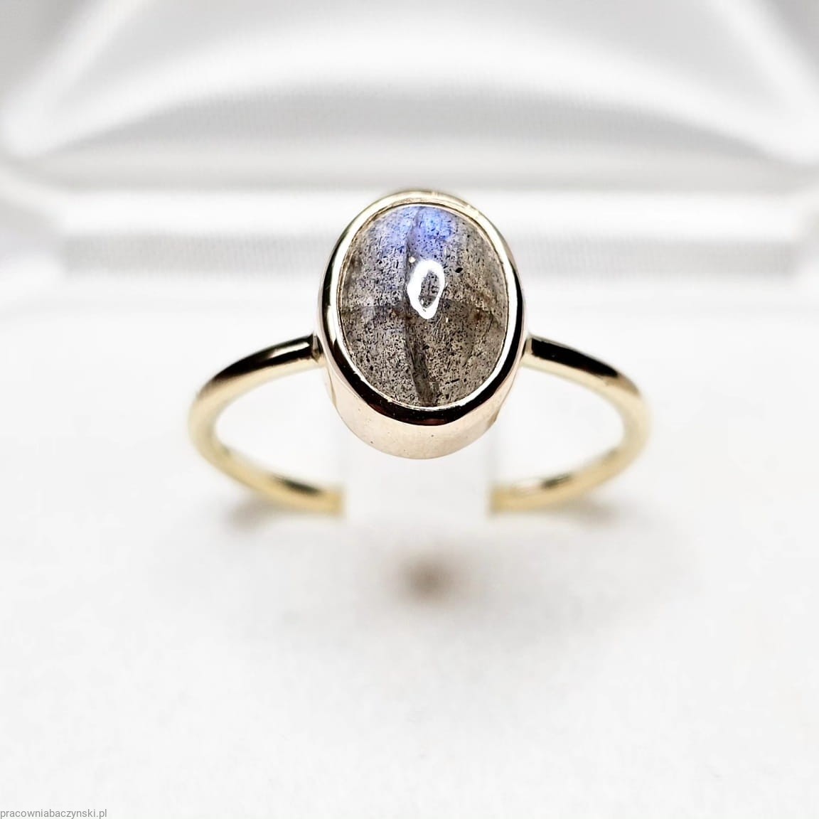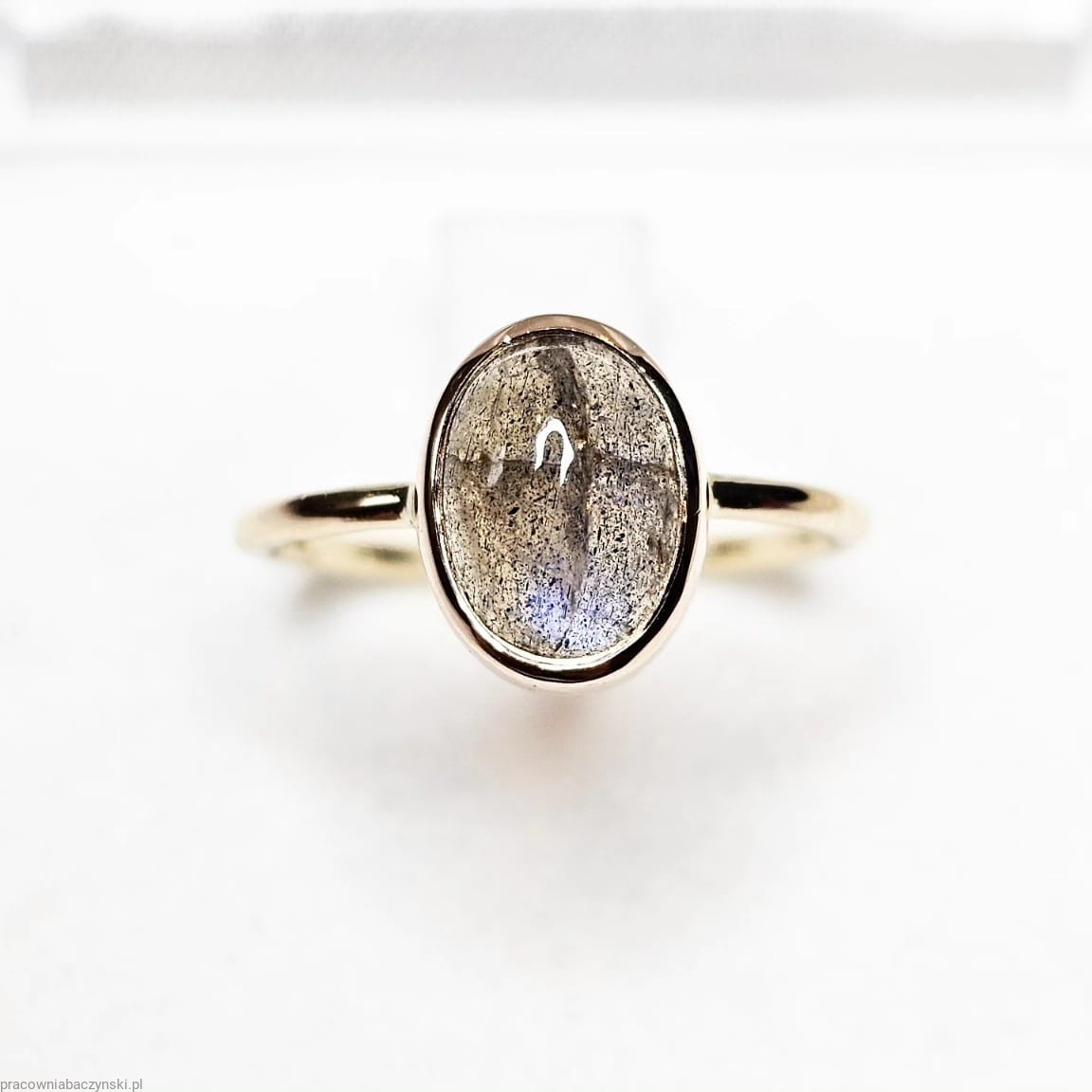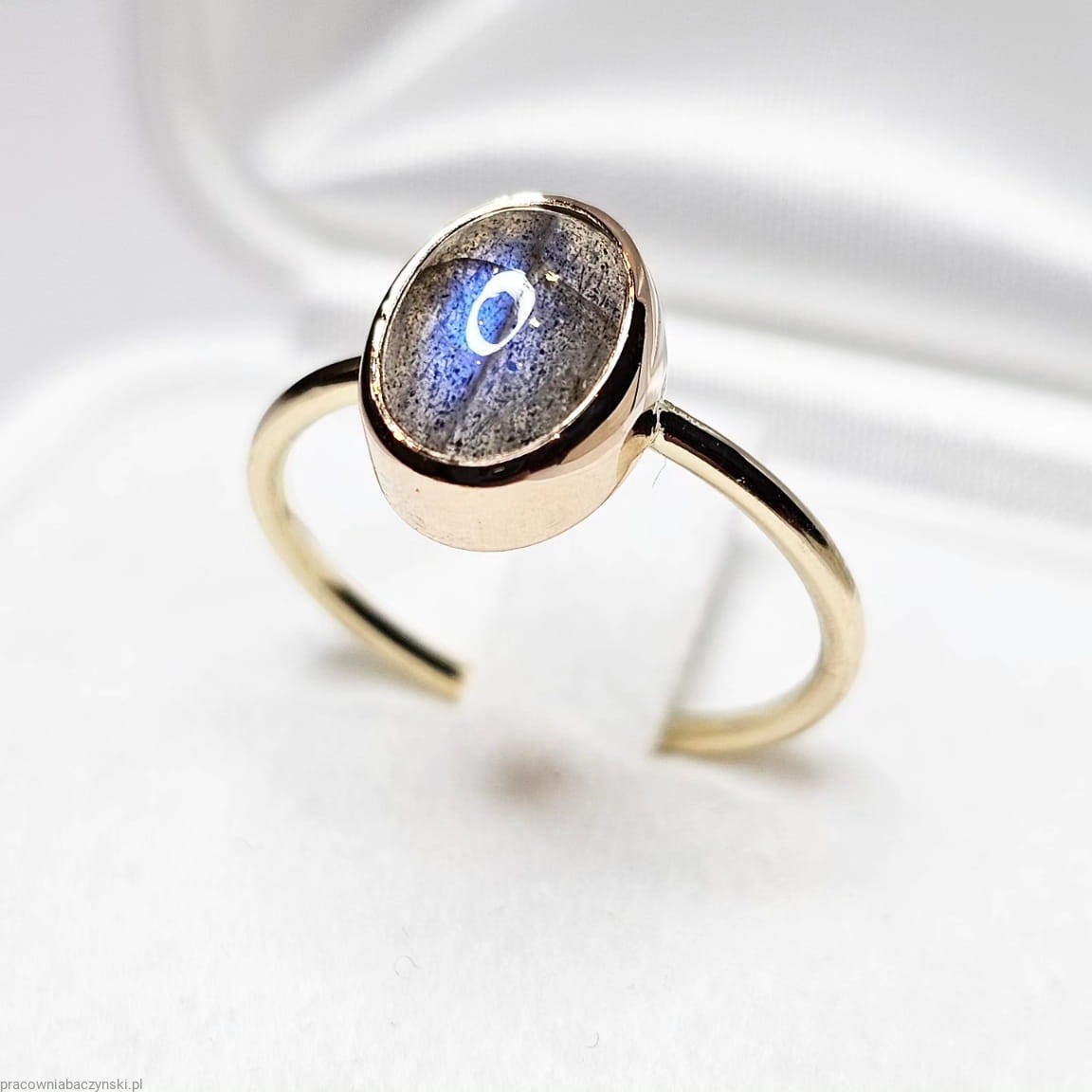 Centralnym punktem tego wyjątkowego pierścionka jest Labradoryt o wymiarach 9/7mm i wadze okoł0 2.5 karata. Labradoryt jest to minerał z gromady krzemianów zaliczany do grupy plagioklazów, twardości 6 w skali Mohsa. Emanuje subtelnością, podobnie jak atmosfera Malagi, miasta pełnego kultury i historii.