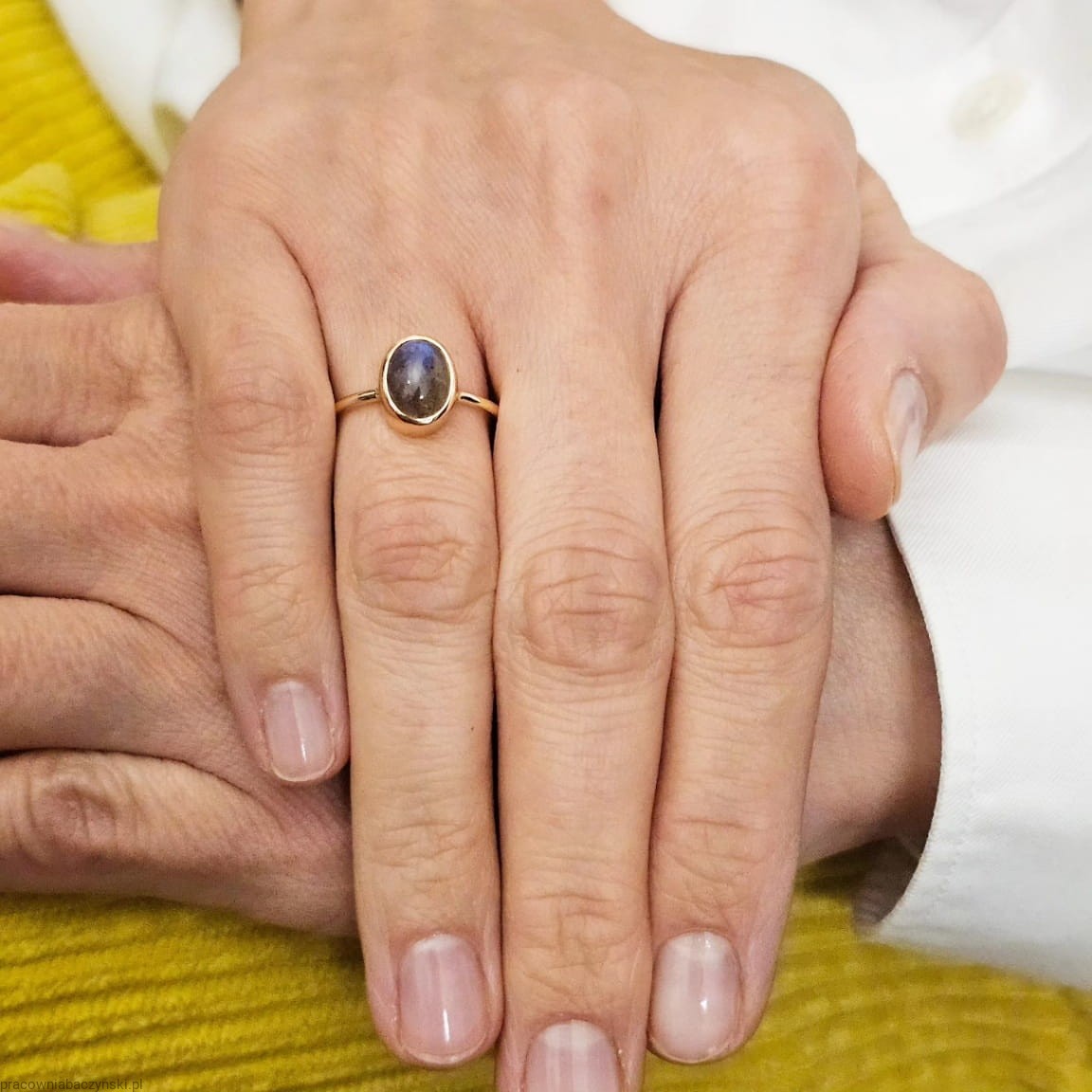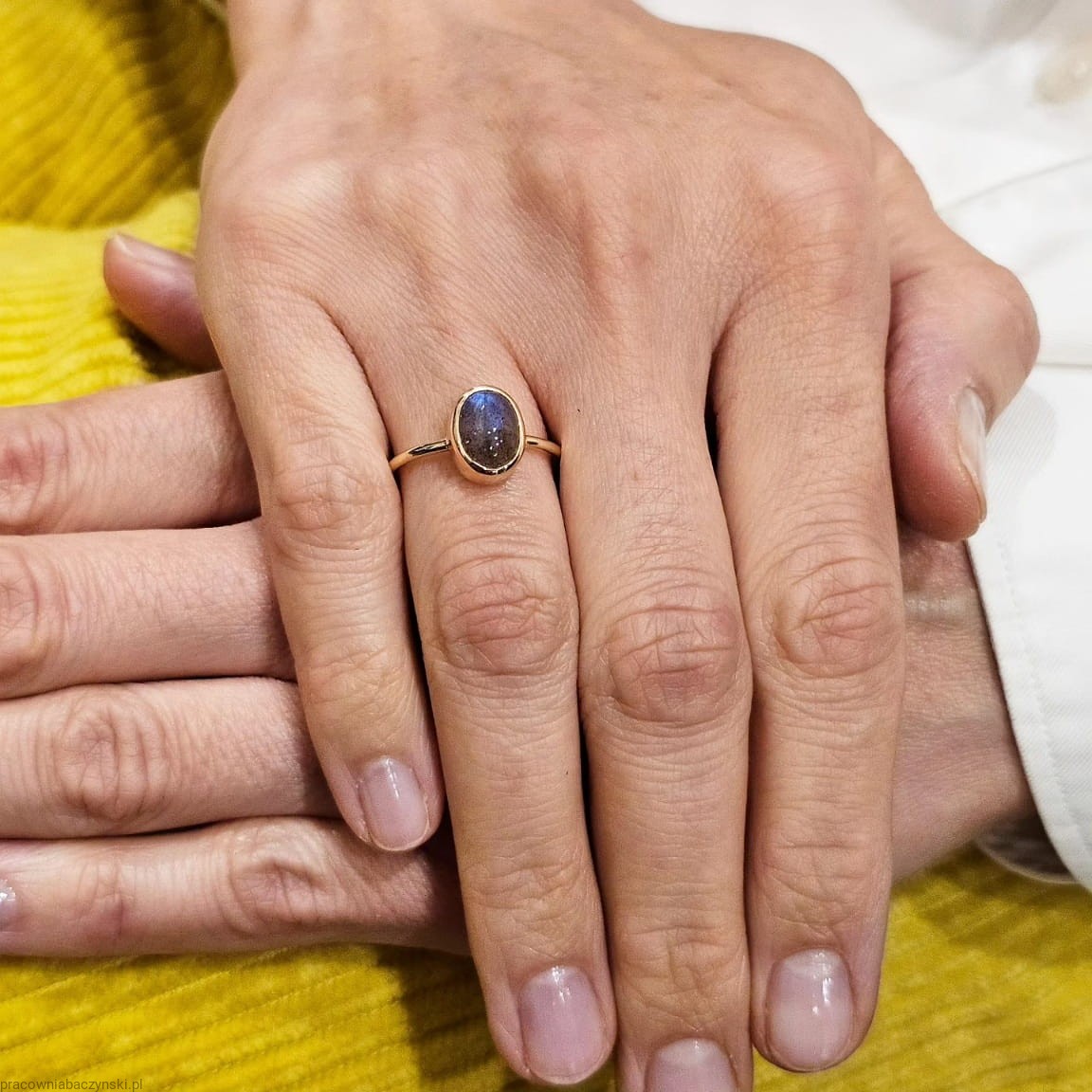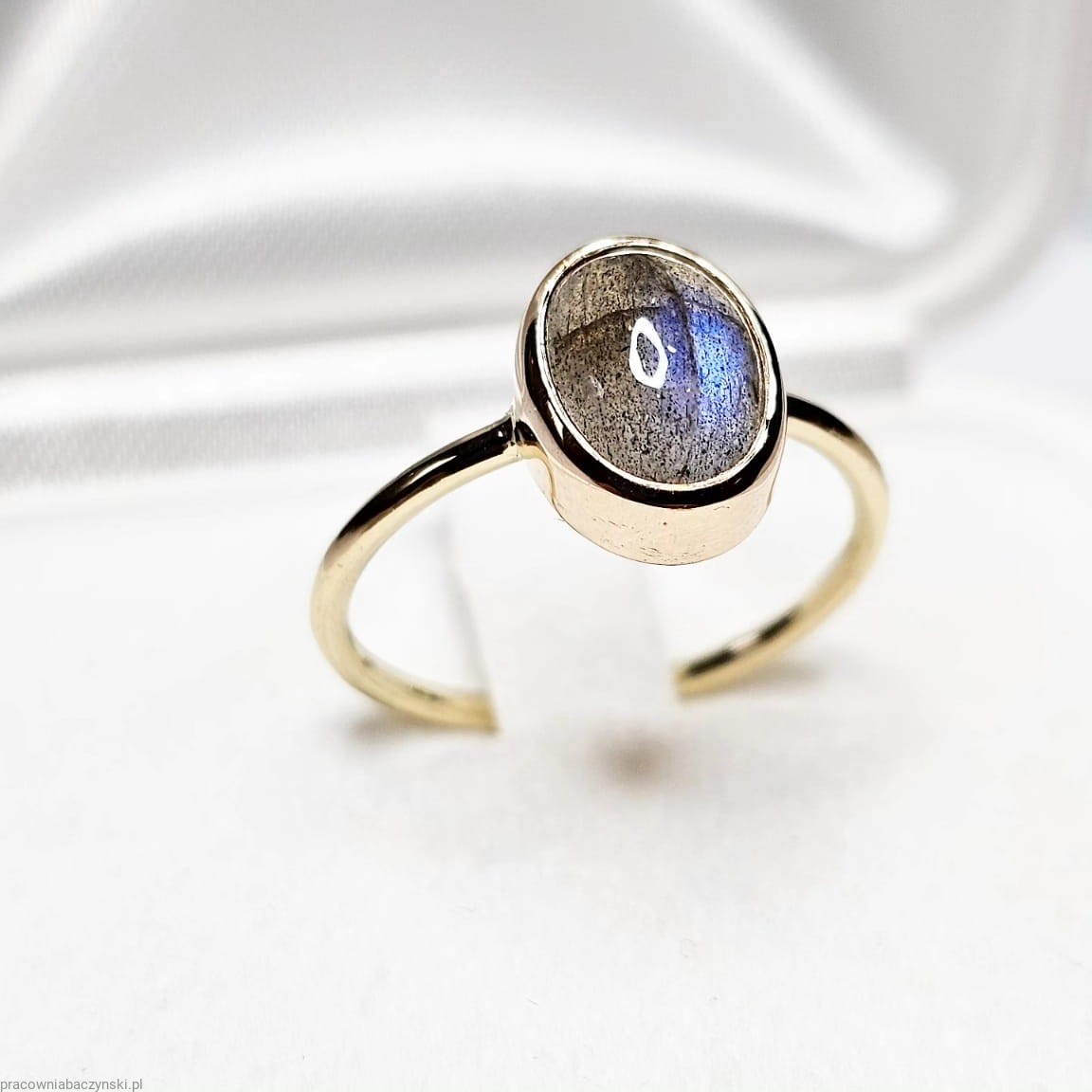 Centralnym punktem tego wyjątkowego pierścionka jest Labradoryt o wymiarach 9/7mm i wadze okoł0 2.5 karata. Labradoryt jest to minerał z gromady krzemianów zaliczany do grupy plagioklazów, twardości 6 w skali Mohsa. Emanuje subtelnością, podobnie jak atmosfera Malagi, miasta pełnego kultury i historii.