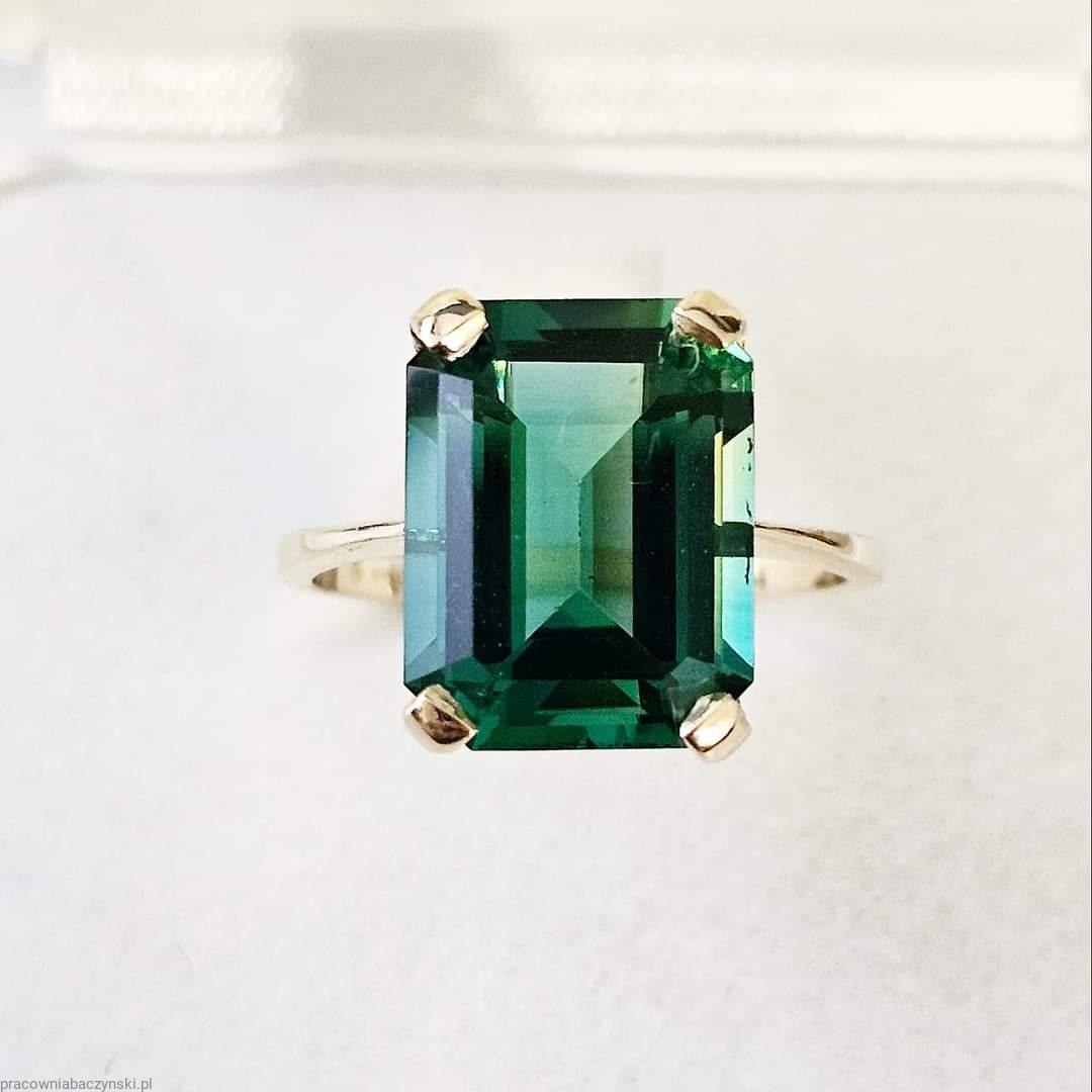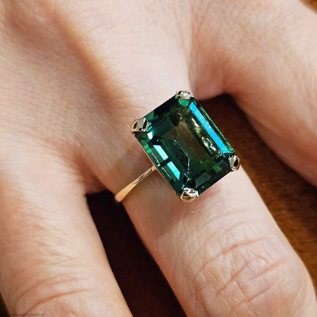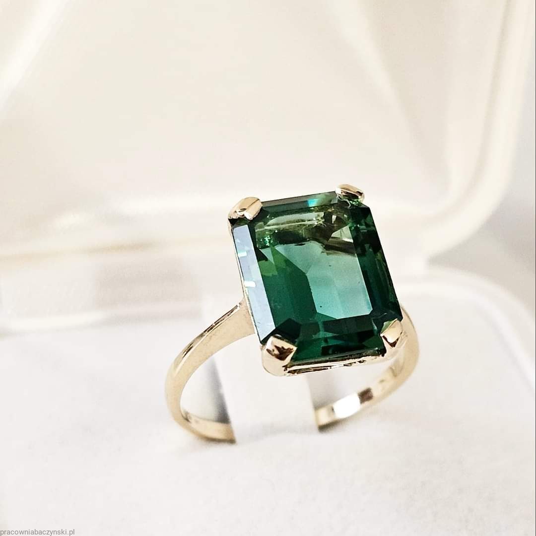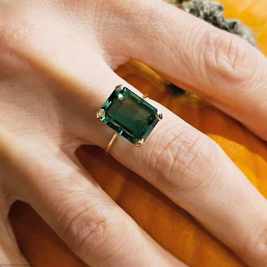 Centralnym elementem tego wyjątkowego pierścionka jest kwarc zielony o szlifie fasetowym oktagon. Kamień ten jest znany ze swojego działania energetycznego oraz unikalnej barwy co nadaje mu wyjątkowy charakter. Wymiary kamienia to 14/10mm, a jego masa to około 6.3ct karatów. Kamień ten jest umiejętnie osadzony w złocie, tworząc harmonijny i piękny układ.