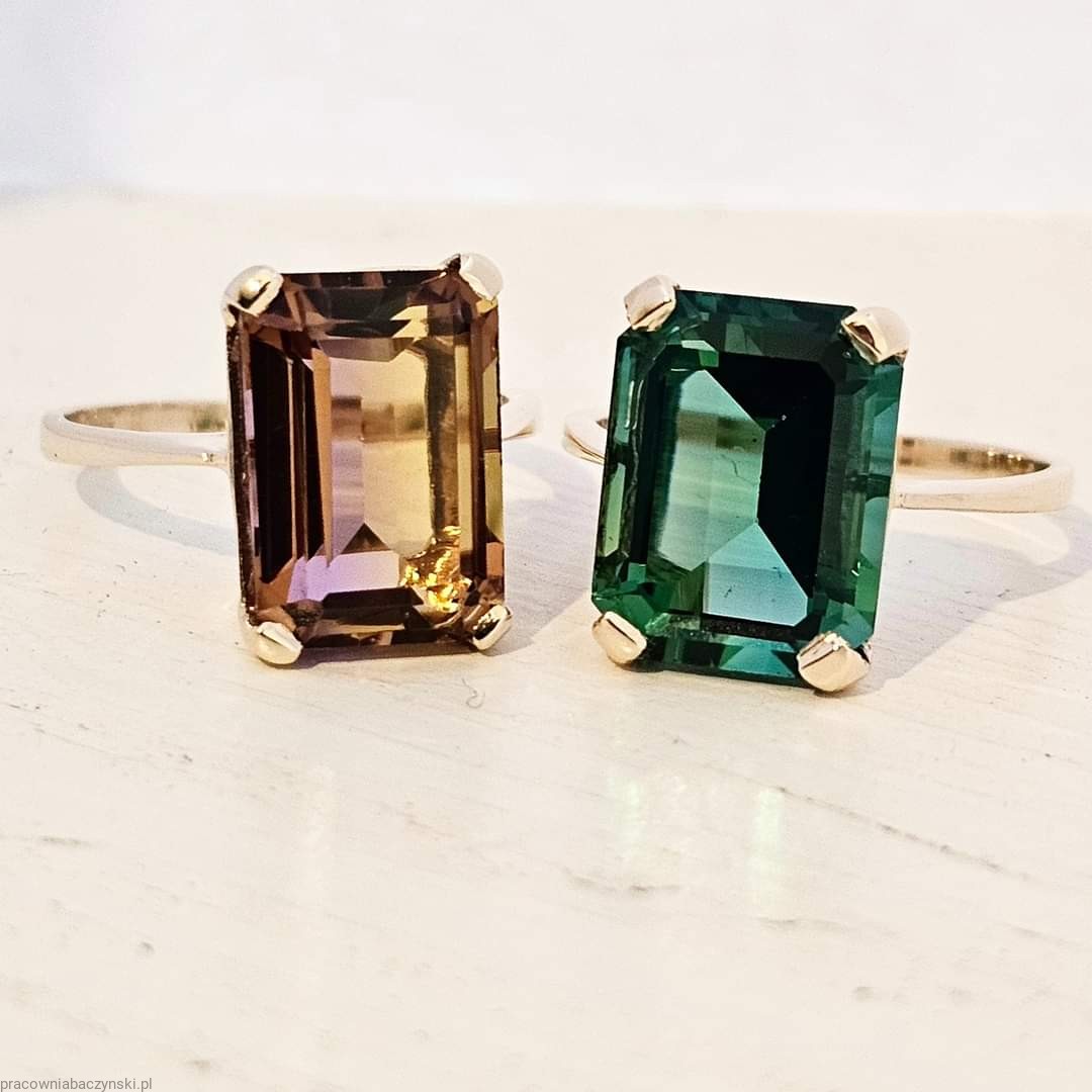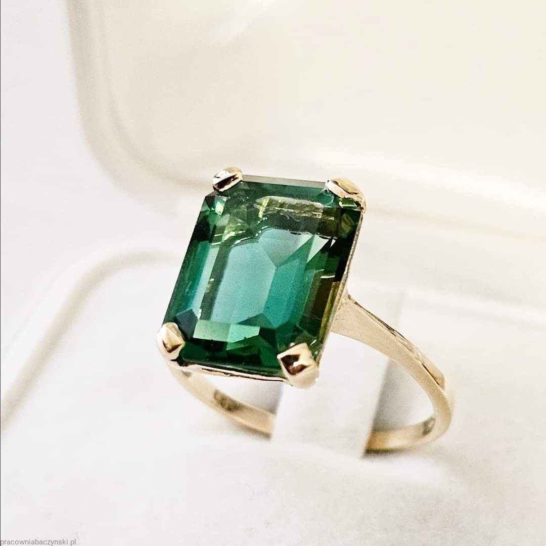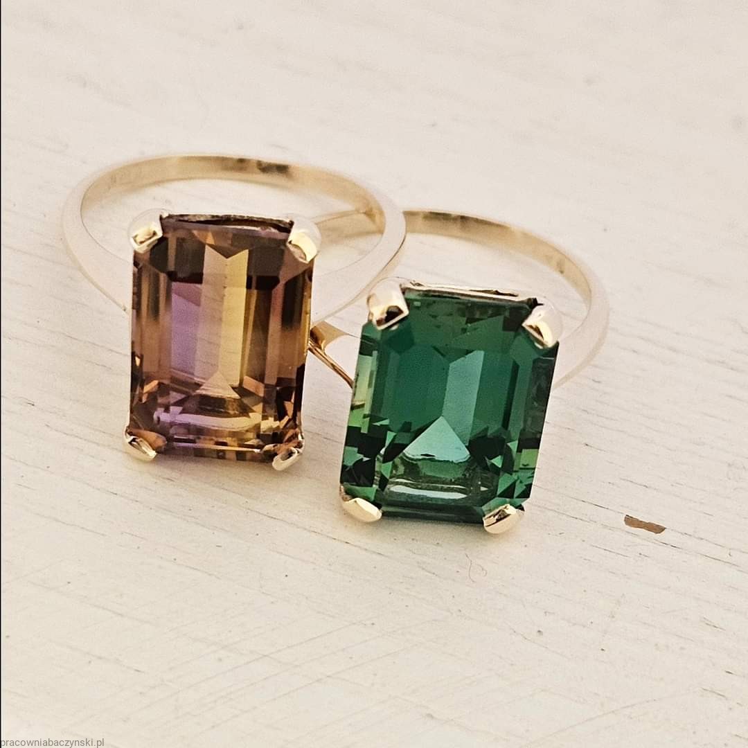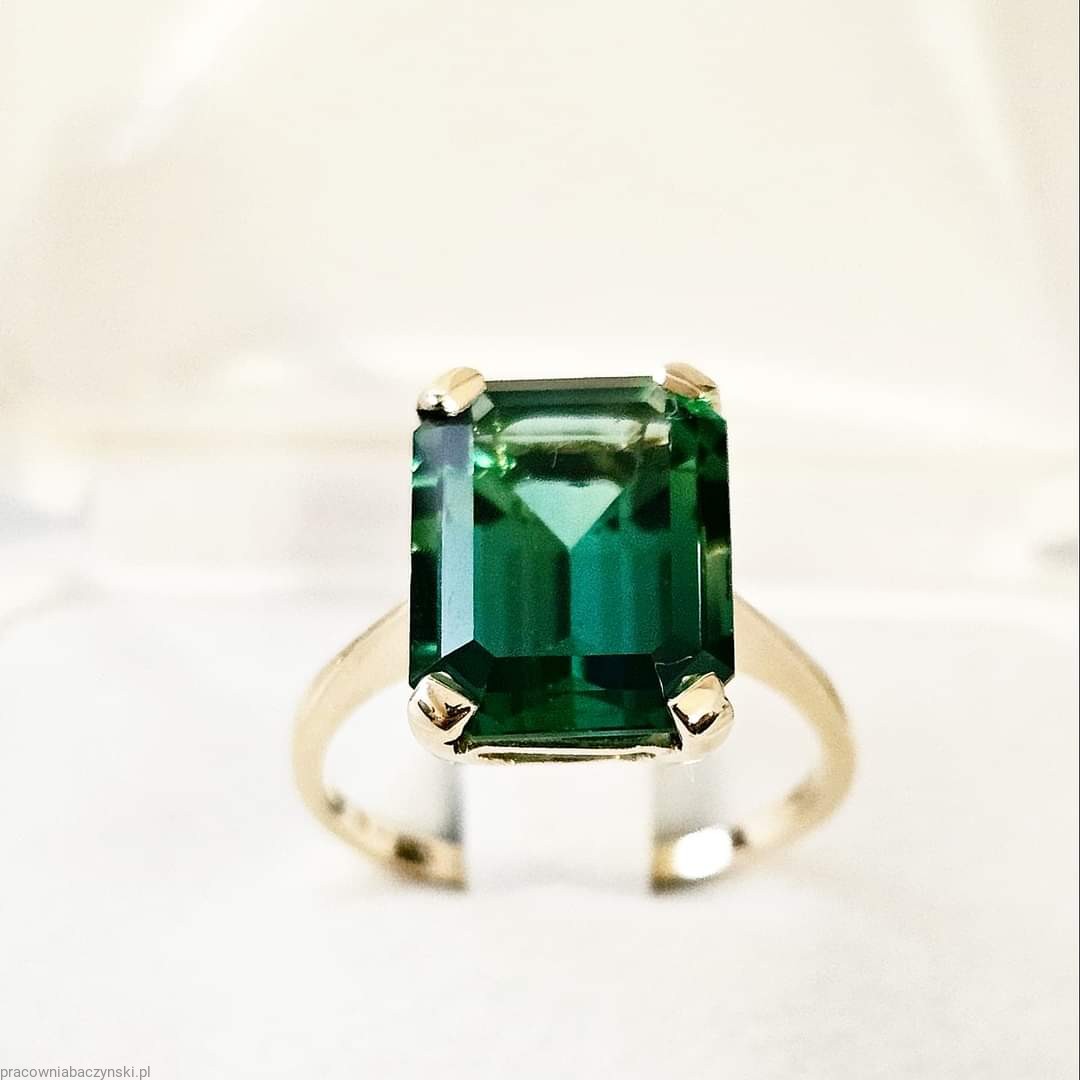 Centralnym elementem tego wyjątkowego pierścionka jest kwarc zielony o szlifie fasetowym oktagon. Kamień ten jest znany ze swojego działania energetycznego oraz unikalnej barwy co nadaje mu wyjątkowy charakter. Wymiary kamienia to 14/10mm, a jego masa to około 6.3ct karatów. Kamień ten jest umiejętnie osadzony w złocie, tworząc harmonijny i piękny układ.