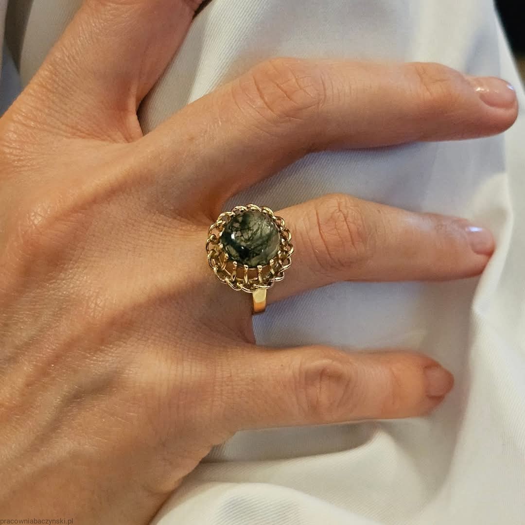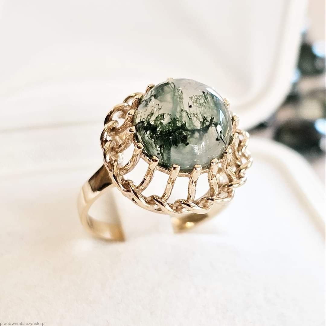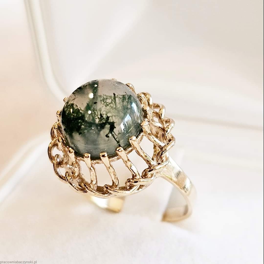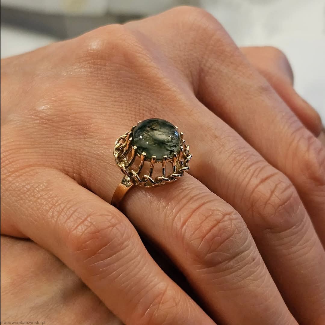 Pierścień Praga Vintage to prawdziwe arcydzieło jubilerskiej sztuki. Projekt został starannie opracowany pod kątem minerału który wręcz uwielbia światło. Kosz pierścionka oddala kamień na 4mm od dłoni powodując przestrzeń na światło. Minerał jakim jest Agat mszysty uwielbia promienie słońca. 10mm średnicy i wyraźne wtrącenia mchu wewnątrz minerału. Wykonany z wysokiej jakości złota 585 o dolidnej konstrukcji . Masa to ponad 5g . Oprawa ręczną w drobnych łapach. Pierścień Praga Vintage to elegancją I styl vintage .