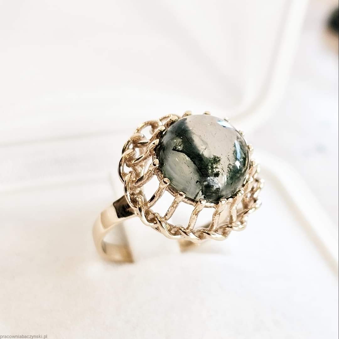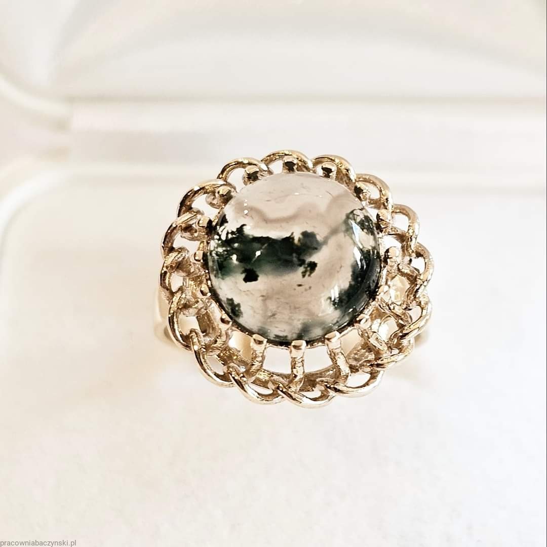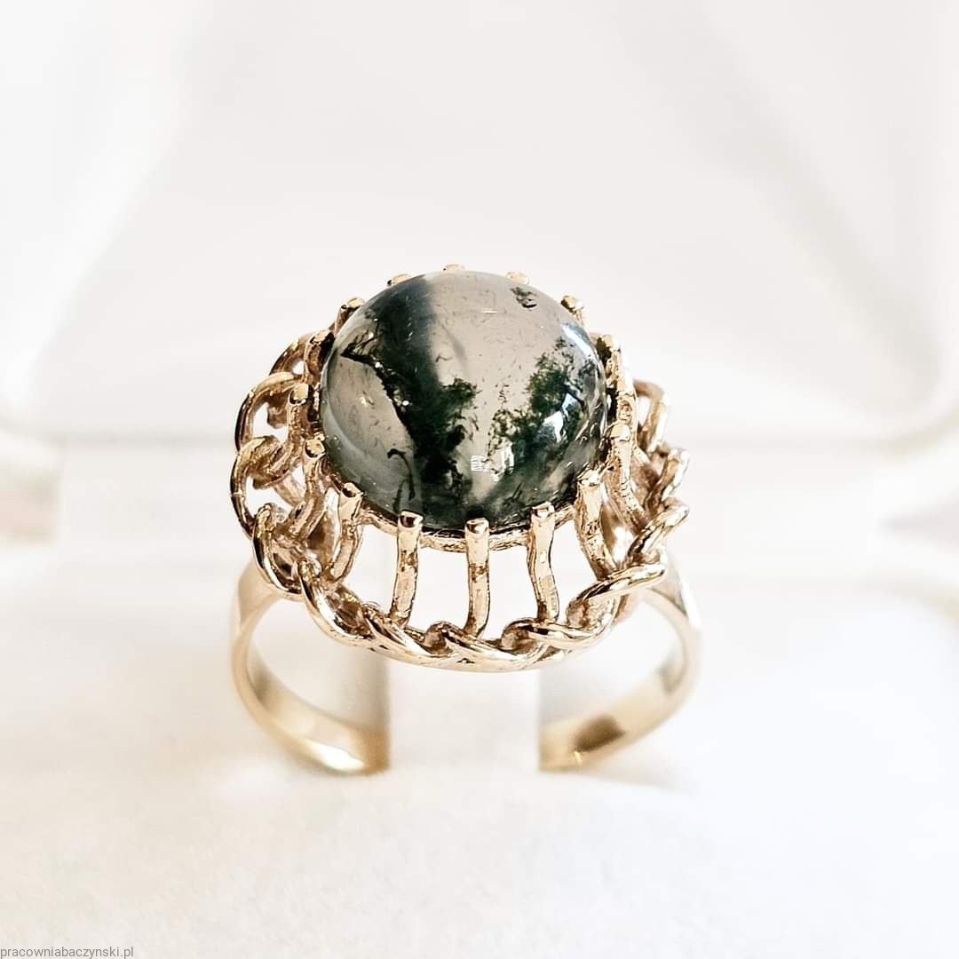 Pierścień Praga Vintage to prawdziwe arcydzieło jubilerskiej sztuki. Projekt został starannie opracowany pod kątem minerału który wręcz uwielbia światło. Kosz pierścionka oddala kamień na 4mm od dłoni powodując przestrzeń na światło. Minerał jakim jest Agat mszysty uwielbia promienie słońca. 10mm średnicy i wyraźne wtrącenia mchu wewnątrz minerału. Wykonany z wysokiej jakości złota 585 o dolidnej konstrukcji . Masa to ponad 5g . Oprawa ręczną w drobnych łapach. Pierścień Praga Vintage to elegancją I styl vintage .