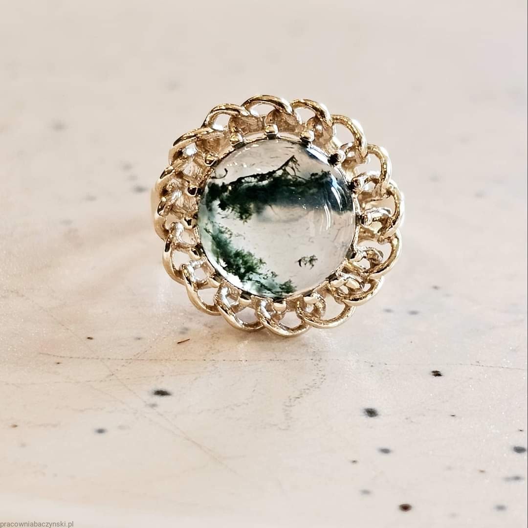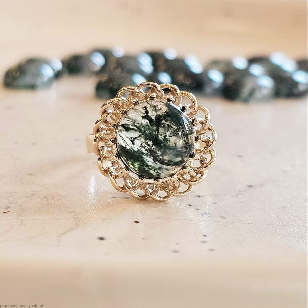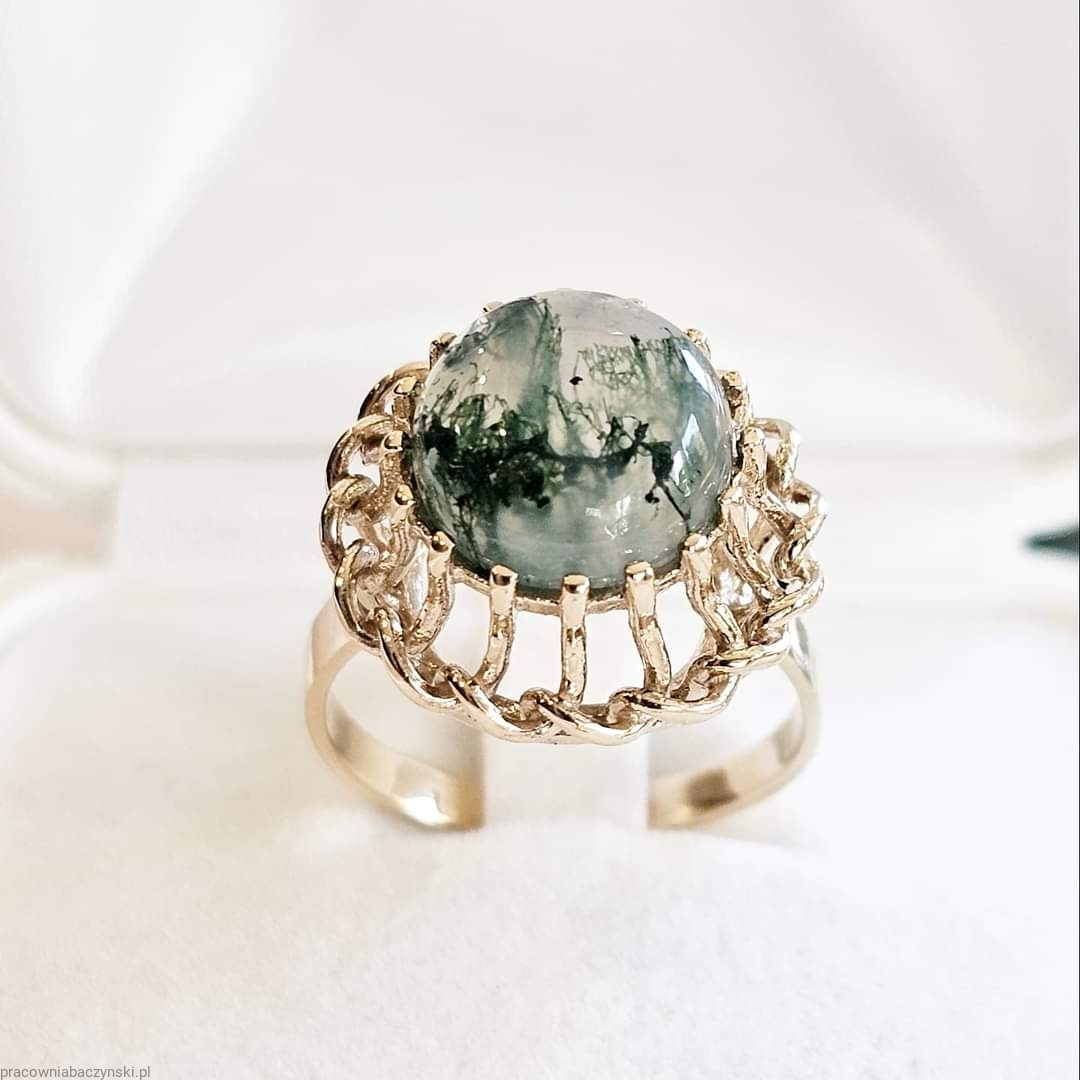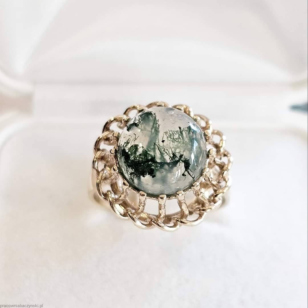 Pierścień Praga Vintage to prawdziwe arcydzieło jubilerskiej sztuki. Projekt został starannie opracowany pod kątem minerału który wręcz uwielbia światło. Kosz pierścionka oddala kamień na 4mm od dłoni powodując przestrzeń na światło. Minerał jakim jest Agat mszysty uwielbia promienie słońca. 10mm średnicy i wyraźne wtrącenia mchu wewnątrz minerału. Wykonany z wysokiej jakości złota 585 o dolidnej konstrukcji . Masa to ponad 5g . Oprawa ręczną w drobnych łapach. Pierścień Praga Vintage to elegancją I styl vintage .