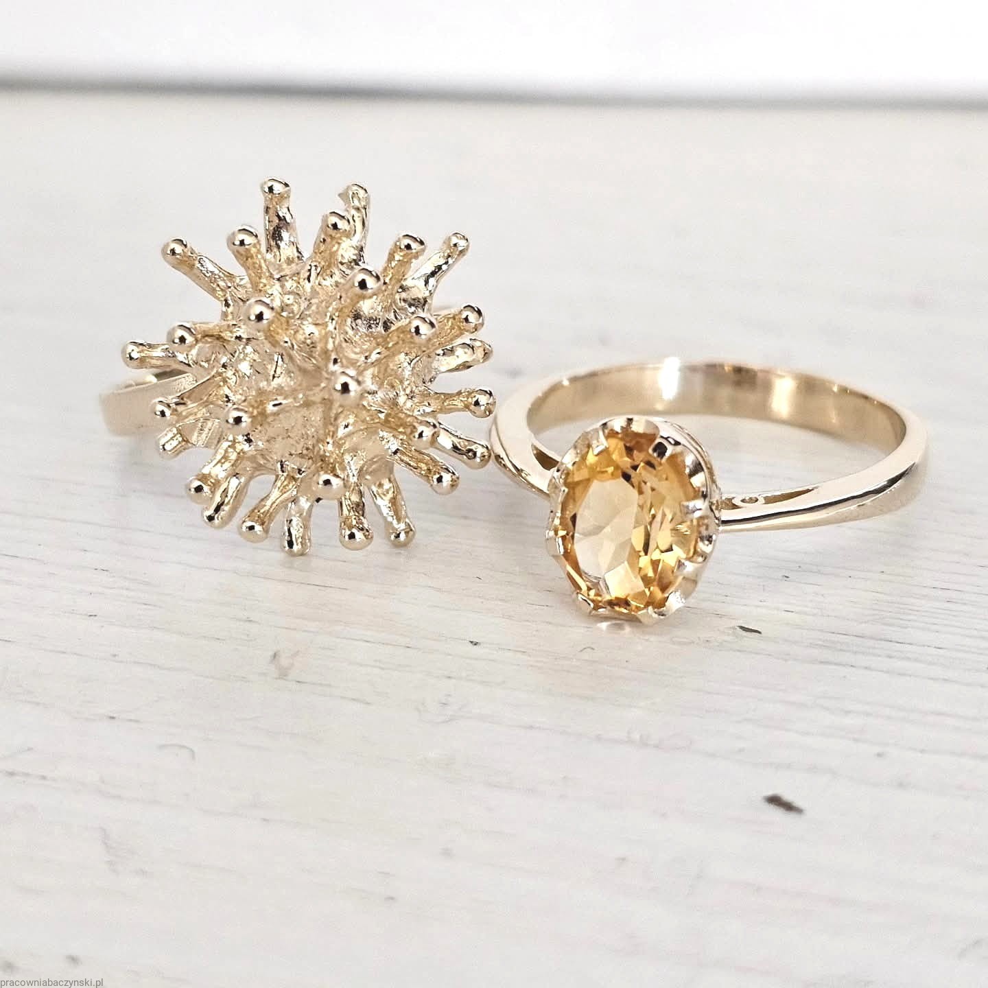 Jako centralny punkt pierścionka znajduje się przepiękny żółty Cytryn o wymiarach 9/7. Jego masa wynosi około 2ct, co czyni go nie tylko pięknym, ale również imponującym kamieniem centralnym.